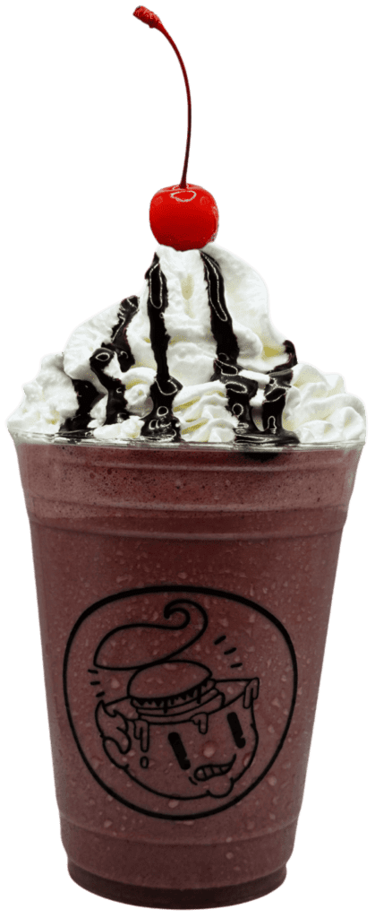 Cremosa malteada de helado de chocolate, trozos de dulces cerezas y jarabe de cereza, acompañada de crema batida y jarabe de chocolate.