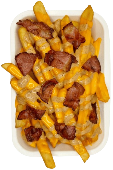 Crujientes papas a la francesa con salsa de queso, salsa secreta y trozos de tocino ahumado