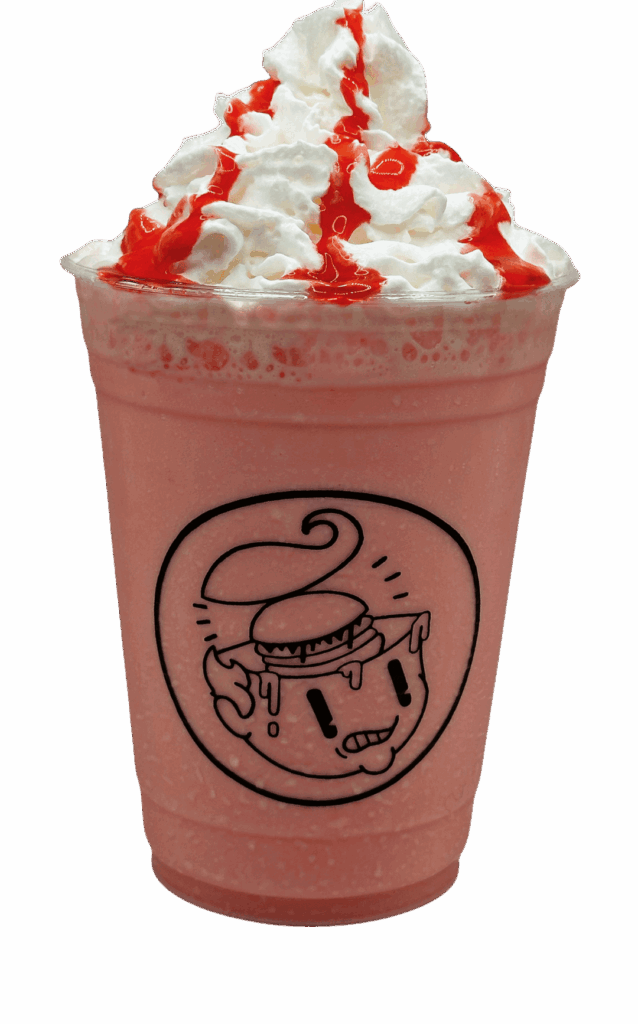 Cremosa malteada de helado de fresa, acompañada de crema batida y jarabe de fresa.