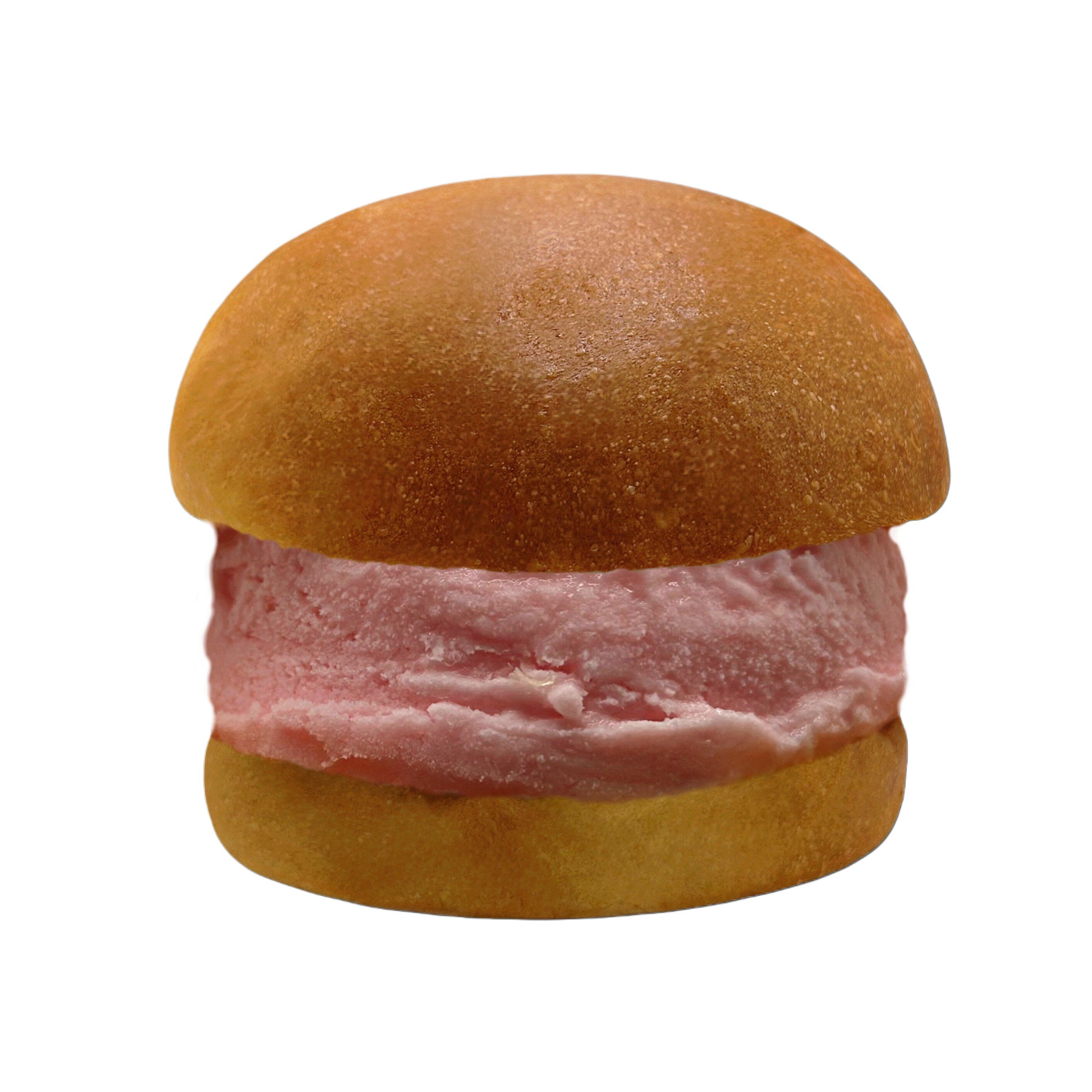 Helado cremoso de fresa atrapado entre dos esponjosas rebanadas de pan con mantequilla.