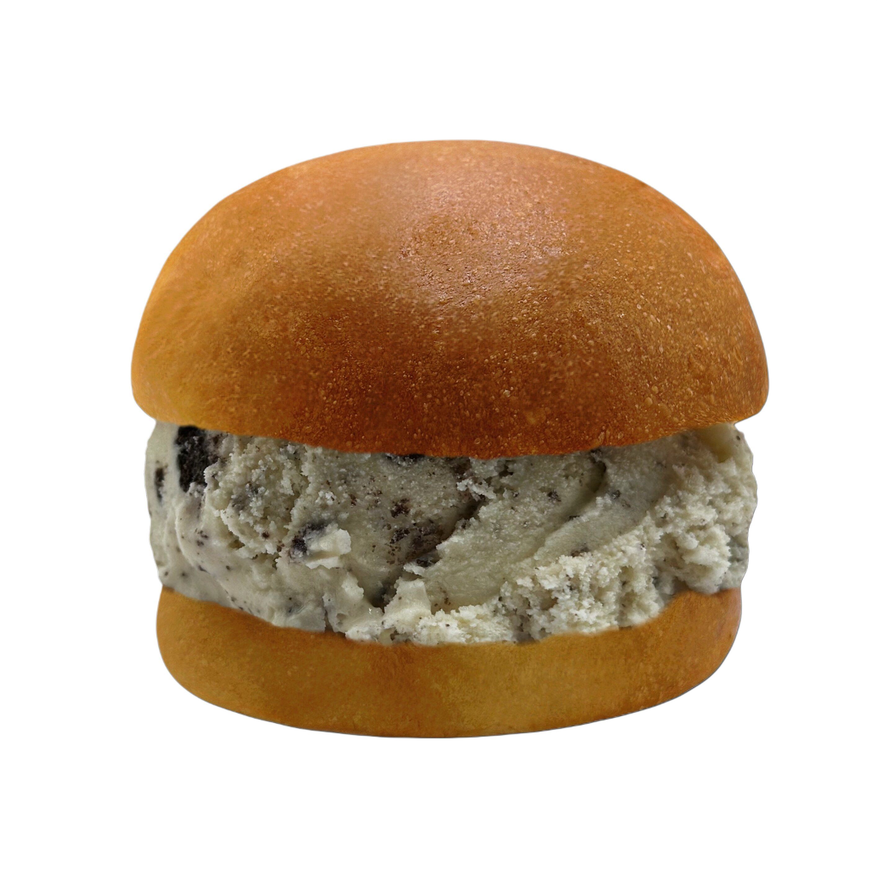 Helado cremoso de Oreo® atrapado entre dos esponjosas rebanadas de pan con mantequilla.
