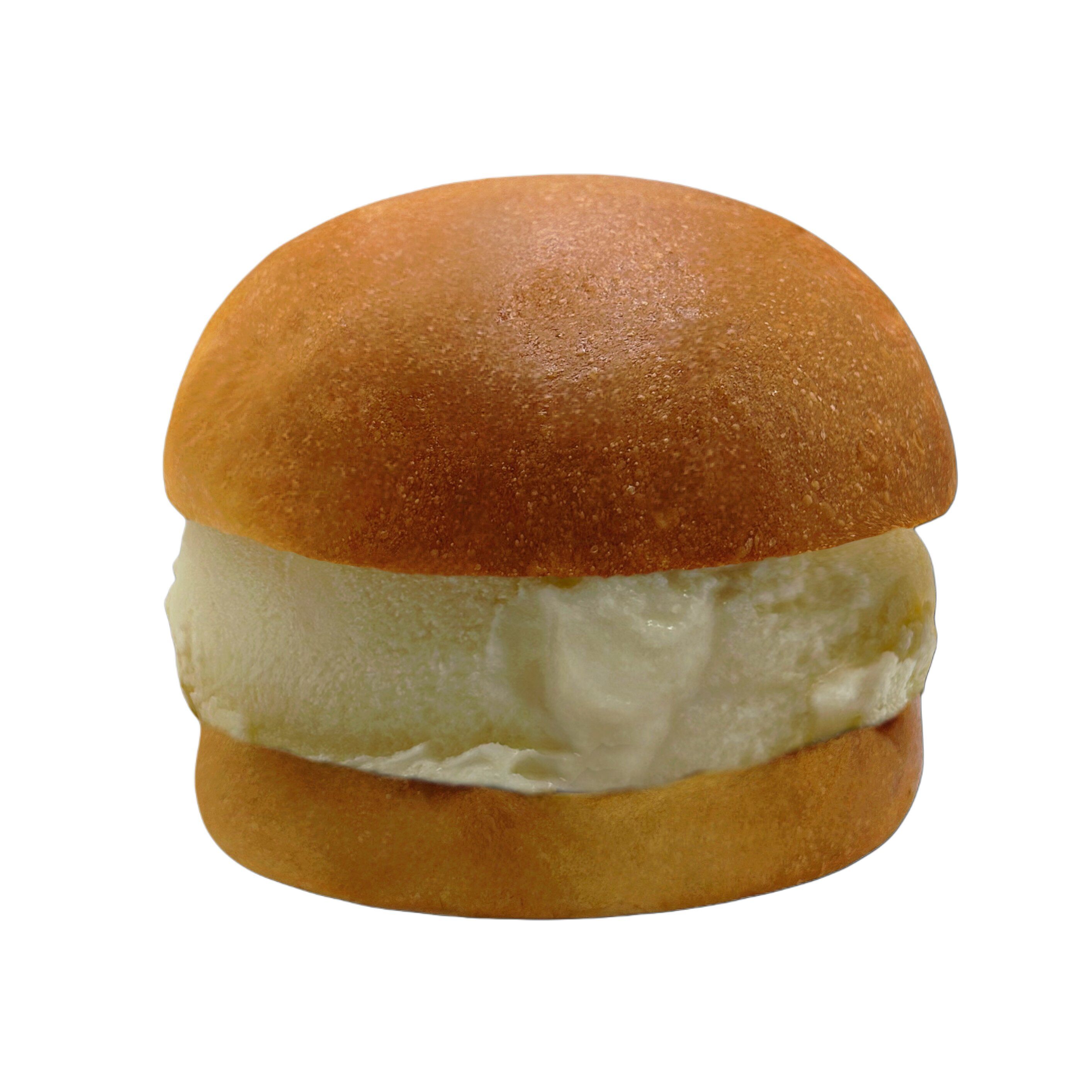 Helado cremoso de vainilla atrapado entre dos esponjosas rebanadas de pan con mantequilla.
