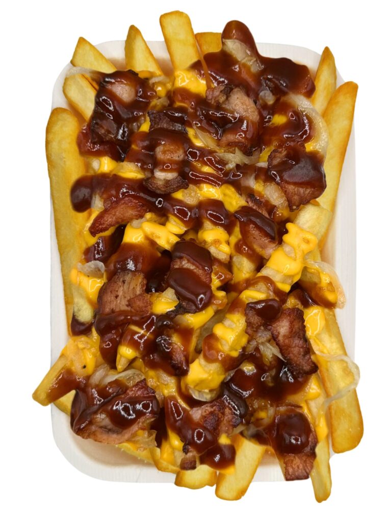 Crujientes papas a la francesa con salsa de queso, salsa BBQ, cebolla caramelizada y trozos de tocino ahumado